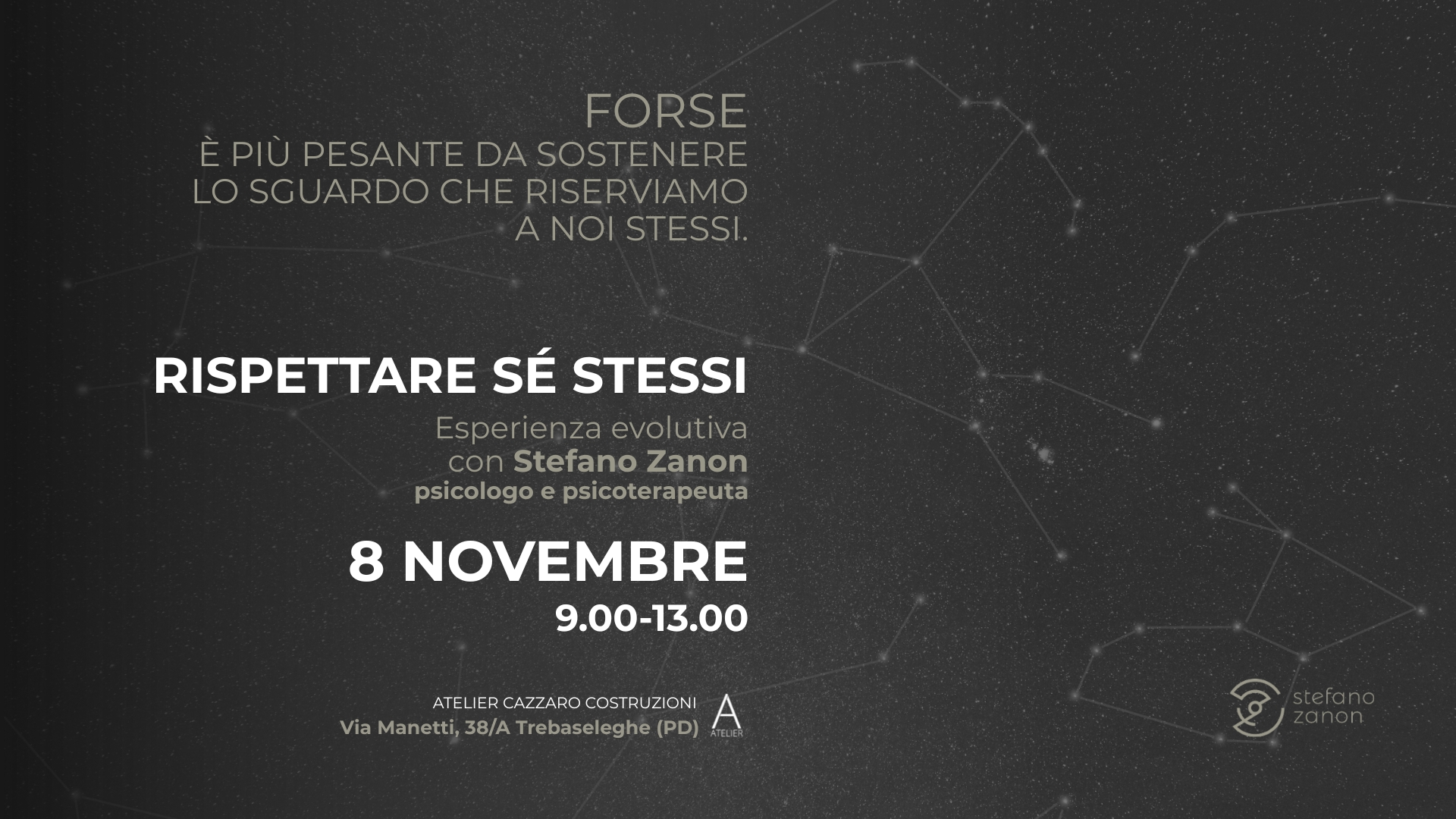 “Rispettare sé stessi” è un’esperienza di alta formazione pensata per chi vuole scegliere e agire in armonia con il proprio sentire, mettendo in primo piano sè e la propria sensibilità nel rispetto dei propri confini e quelli delle altre persone.